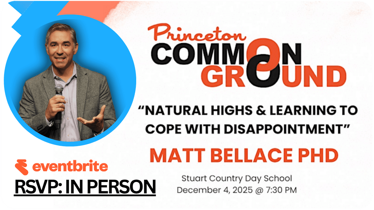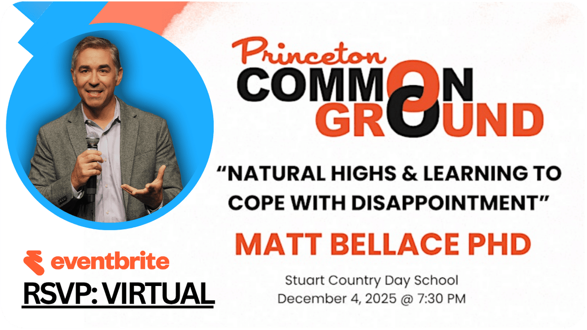 Join the Princeton parent community for a free talk by Dr.Bellace on the mental health of our children, focusing on the concepts of natural highs and emotional resilience.